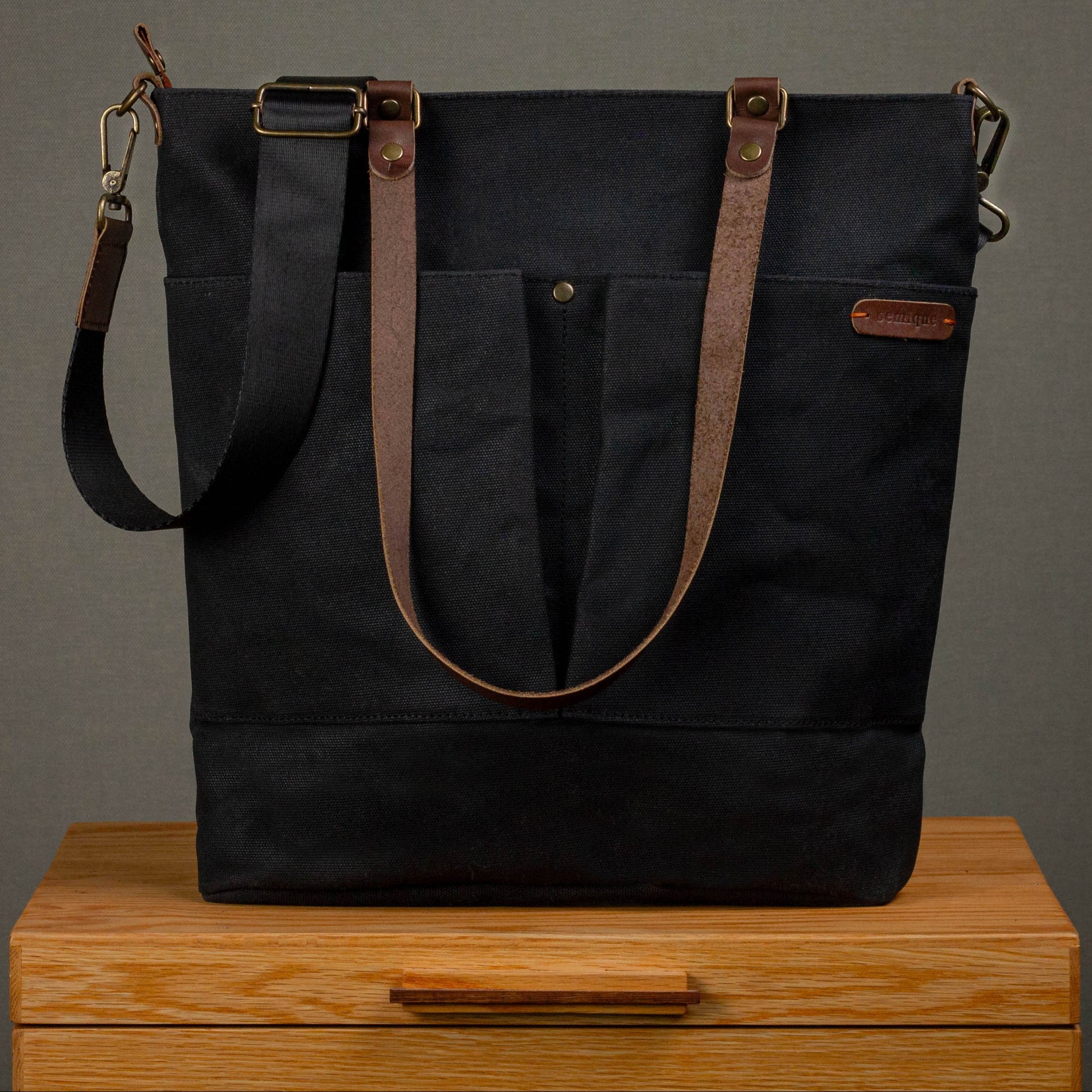 Canvas Crossbody Tote Bag with Leather Handles / Asphalt Black